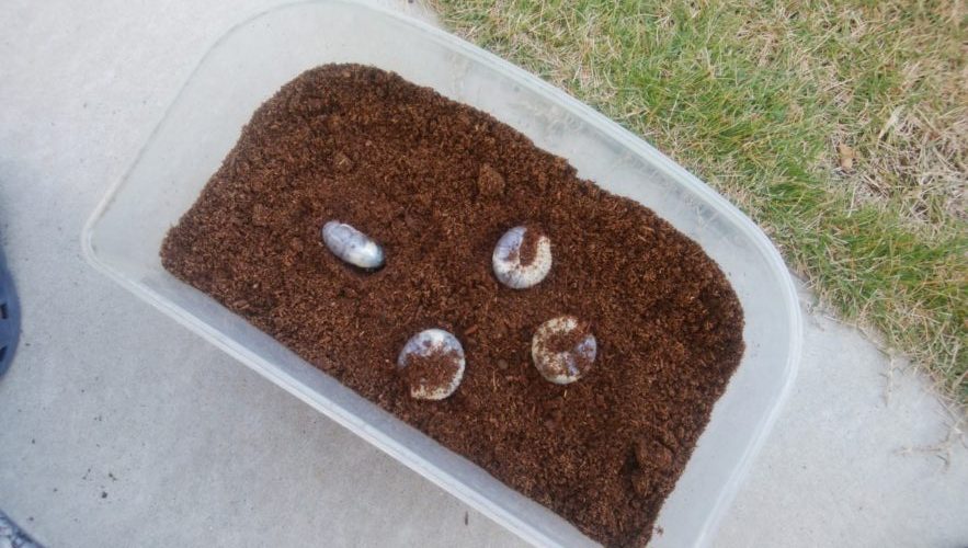 カブトムシの幼虫たちを、息子が手で優しく掘り出す。そして別の虫かごにそっと置く。デデデデデカイ!!!