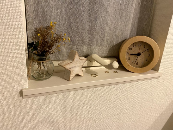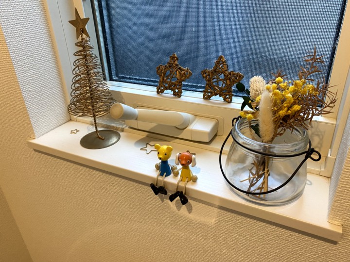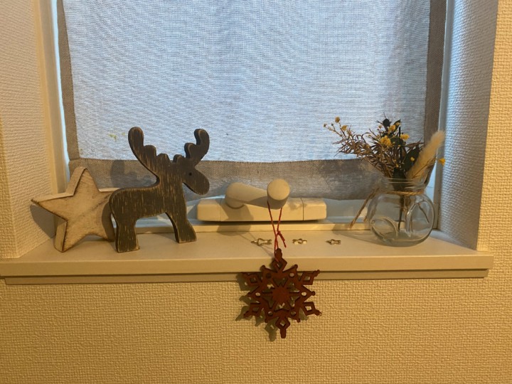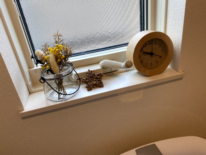 トイレや洗面所の窓枠は100均ドライフラワーと100均の瓶。白い星も100均。時計はニトリ。