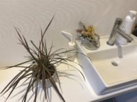夏は水色のものや緑色の観葉植物を飾りたくなる。トイレカウンターはシンプルに。観葉植物は98円くらいだったかな、ホームセンターにて。散らばった星や銀のあみあみの星や観葉植物の下の容器やろうそくは全て100均。小人の飾りは実家から連れてきた昔の雑貨。