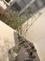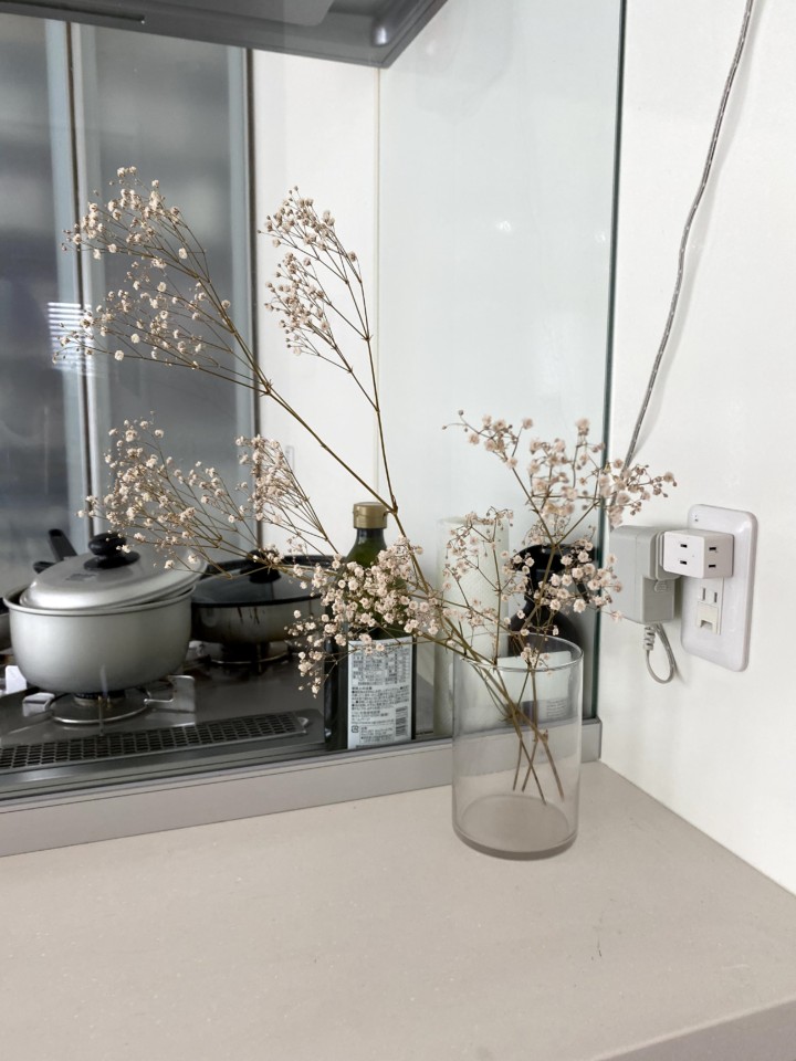 〇キッチン前のカウンターは、カスミソウ♪今はドライフラワーになっている。(入れ物100均、お花は花屋さん)