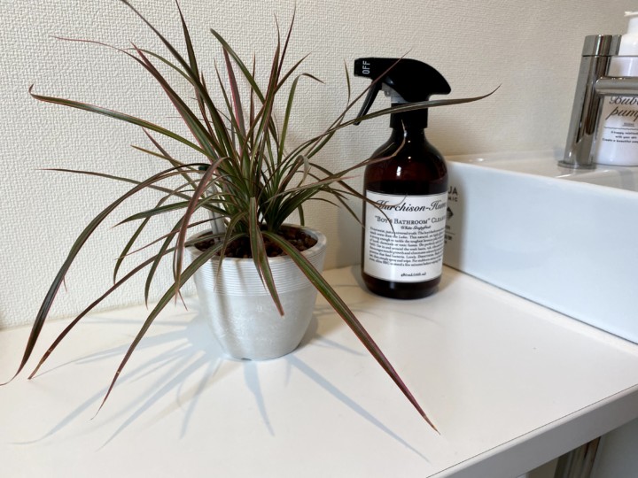 〇トイレカウンターは、観葉植物は花屋さん。ドライフラワーは100均。ガラス容器も100均。星も100均。ハンドソープ入れも100均。寛容著用の水ボトルも100均。