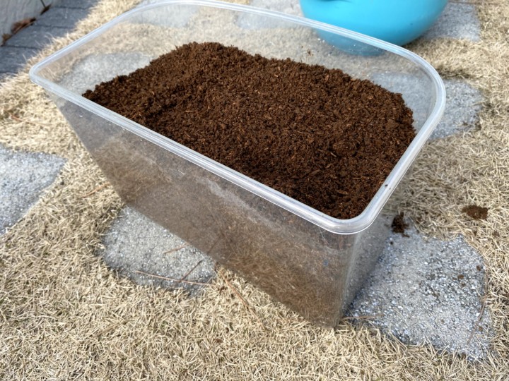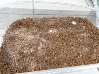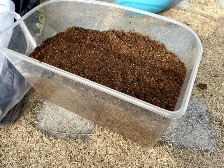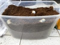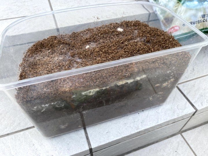 幼虫を救い出し、新しい虫かごにして、底にマットをギュギュっと押しつけ固め、あとはふんわりマットを虫かご8分目くらいまで入れる。その後、幼虫たちを乗せる。幼虫たちは元気よくマットの中へ入っていった。完成。新しいマット気に入ってくれるといいな。