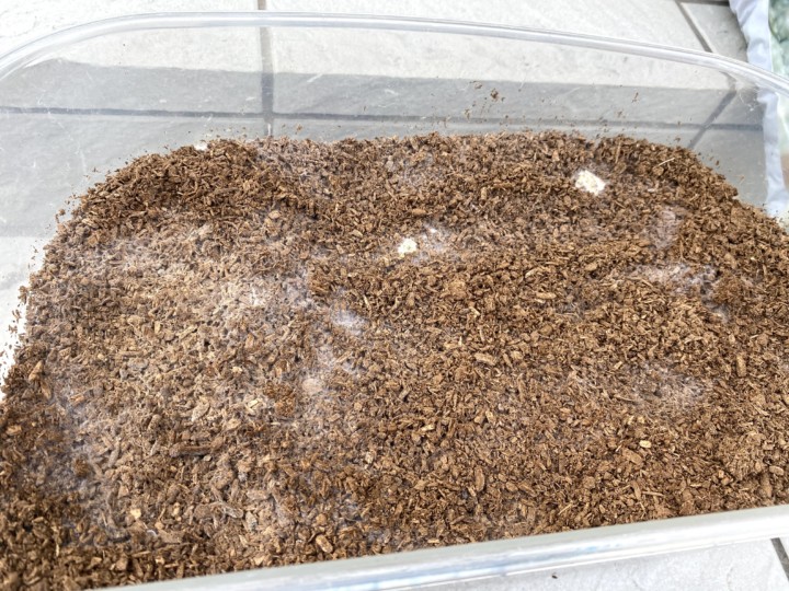 4月になり、そろそろ蛹の準備が始まるかもしれないから触りたくないマット。でもマットを見ると白カビ