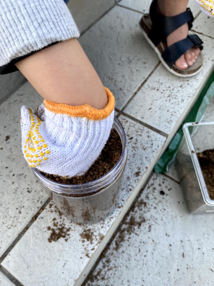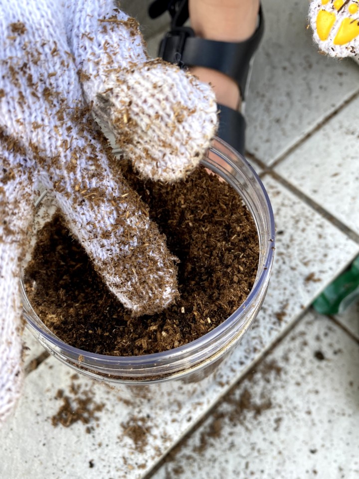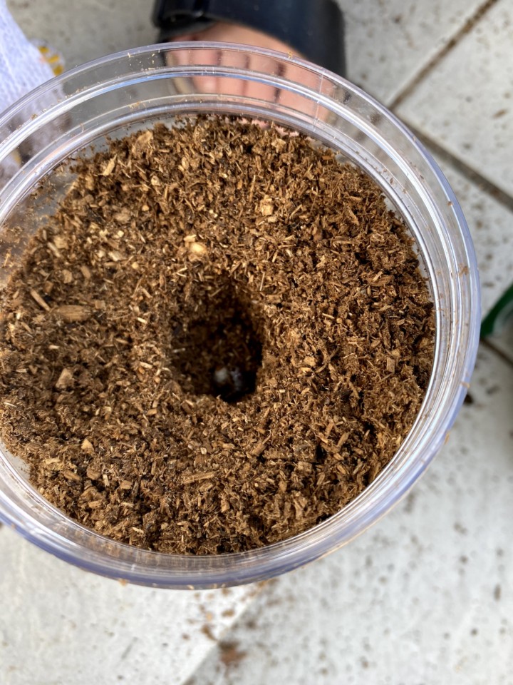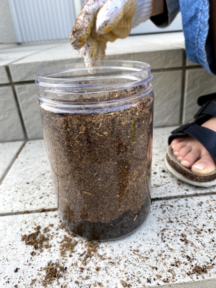 まずマットを9分目くらいまで追加で入れておき、真ん中に穴をあける。穴にクワガタ幼虫を優しくそっと入れて完成。