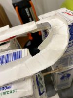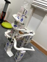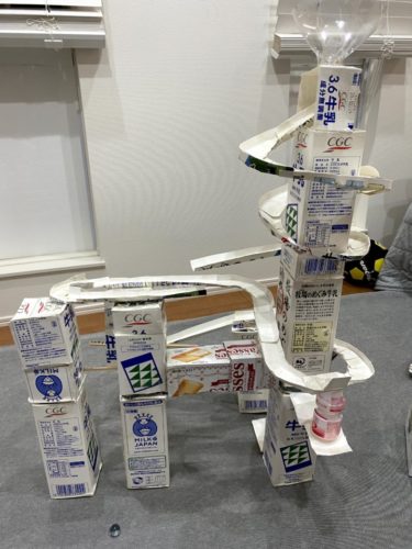 「お母さん!牛乳パックない?」というので、捨てるために開いてしまってあるたくさんの牛乳パックをとりあえず渡した。本当は開いていない状態の牛乳パックで土台を作るはずなのだが、なんのちゅうちょもなく息子はセロハンテープを上手に使い土台を作っていく。コースター部分は本を見ながら、見様見真似でカーブを作ったり、滑る部分を作ったり、トンネルを作ったり。興味を持つと作るのが早い早い!!