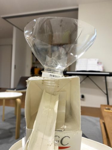 土台の中には公園に落ちているちょっと大きい石を入れれば動かない。スタートはペットボトルの上の部分を切ったものを逆さにして穴を開けた牛乳パックに差し込む。穴がちょうどビー玉のサイズにピッタリでちょうど気持ちよく通過してくれる。良いスタートがきれるのだ。