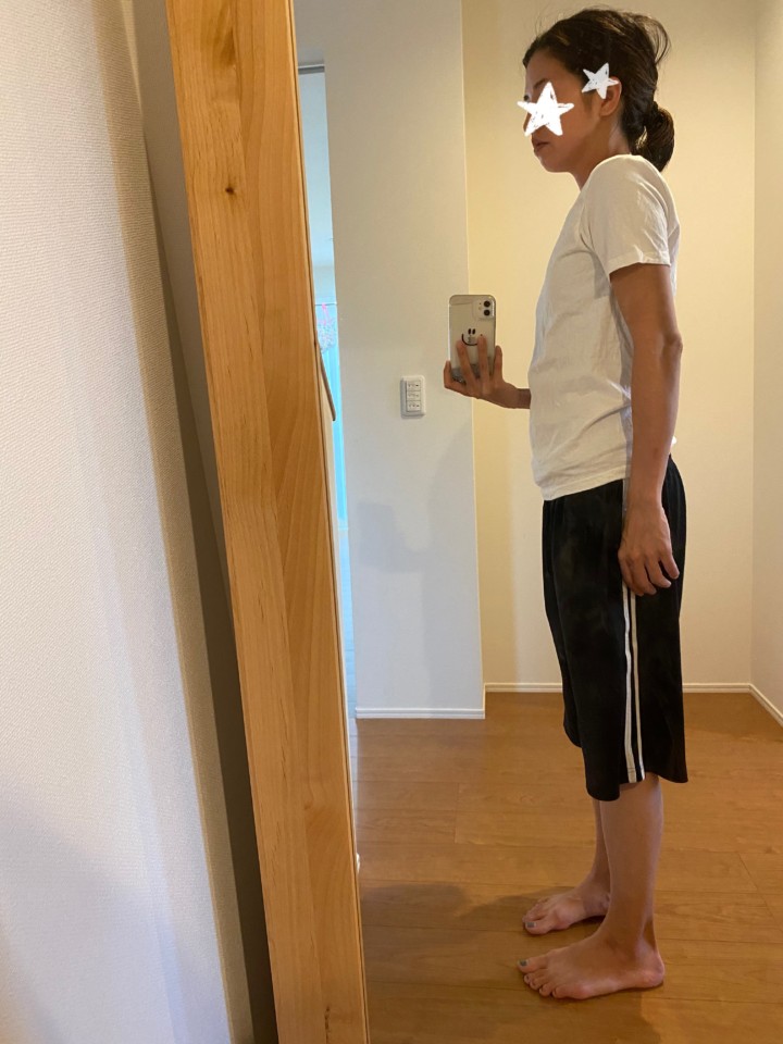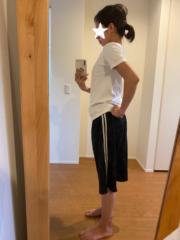 鏡ですぐに自分の体をチェック‼でも見た目は全く変化なし(; ・`д・´)なぜだろ。。インナーマッスルは感じているのに見た目は寸胴のまま(/ω\)