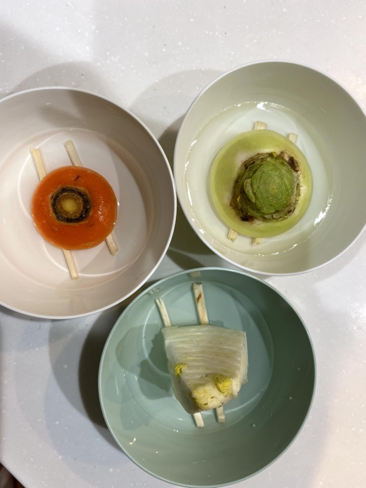 捨てるはずの野菜のくず達。 娘が料理の手伝いをしてくている時に、「お母さん!それ捨てちゃうの?幼稚園のとき本で見たけど、お水に入れておけばまた大きくなるんだよ!やっていたい!!」と言い出した。そんな馬鹿なと思いながら、娘 …