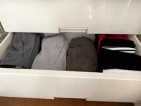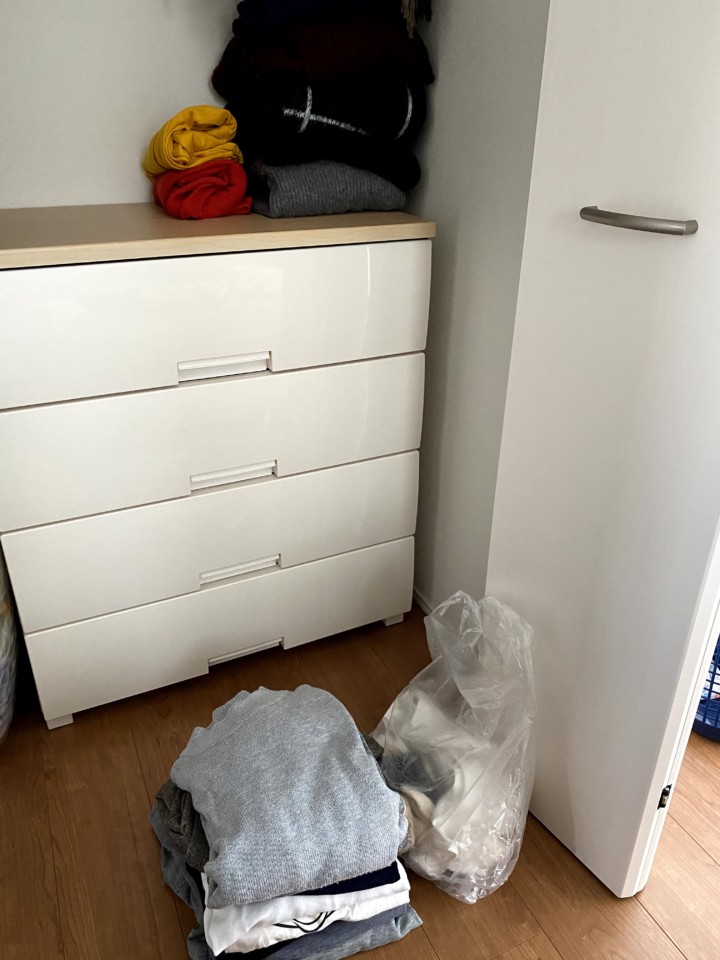 ↑結局冬用のよく着るセーターたちはタンスに入らずタンスの上に。着なくなった洋服とズボンはこのタンスの中ではこれだけ。袋の中は掃除用のシャツとくつ下たち。