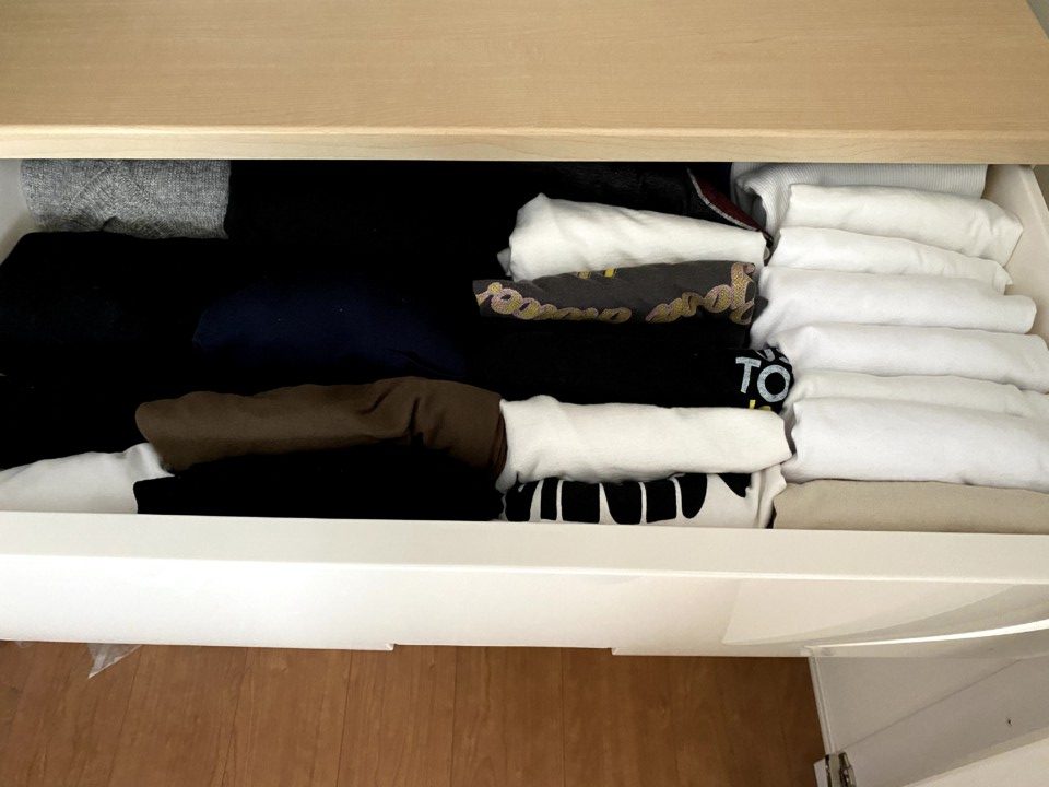 私は気に入った着やすい服をよく着ている決してオシャレではないタイプだ。だから気に入った服がいつも積み重った洋服の一番上にあって、他の服が把握しきれていない。今回片付けをして、ないと思っていた黒いロンTや白いロンT。こんな洋服あったあったと驚く洋服を発見できた。まだつづきだが、とりあえずこの状態までできた。