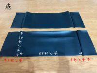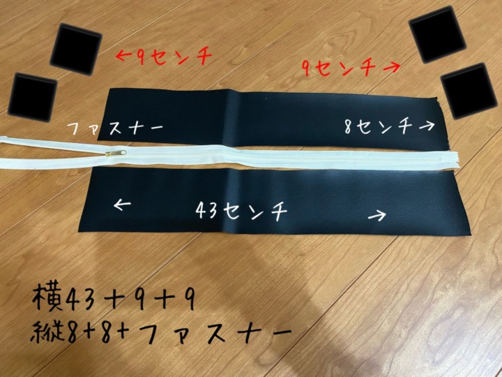 合皮は縫った状態で縦8cm横43cm×2枚。では駄目!!バックの幅の部分もあるため、縦8cm横43+9+9cmを2枚!!