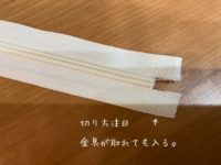 上止め下止めがないためファスナーの金具が取れてしまう。金具が取れてしまったときは、このようにコの字に切っておくと、金具を入れやすい。
