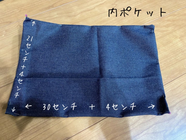 縫い代分は折り曲げた状態で縦21cm横34cm(あとで30cmと歯磨き入れ用の4cmに分けるように印をつけておく。)