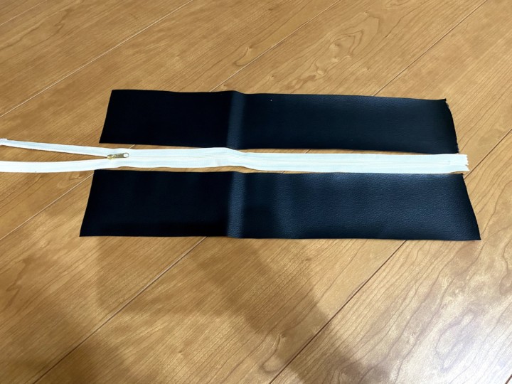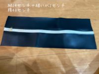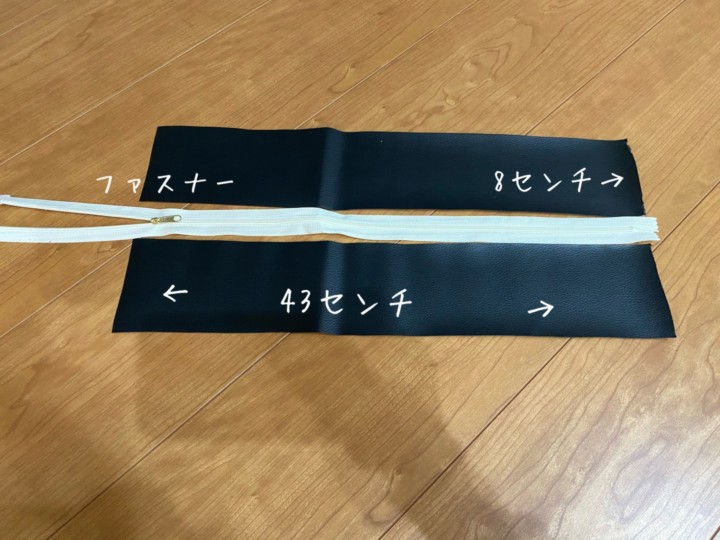 合皮の縦はファスナーの幅によって調整する。縫い代分は折り曲げた状態で全部で縦51cmになるように。そして縫い合わせる。