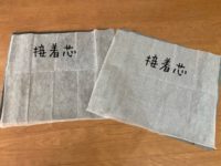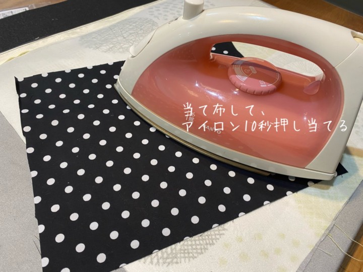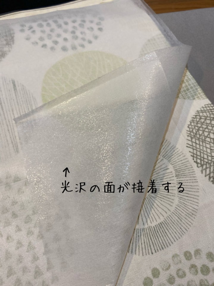 貼り方は、接着芯の光沢がある面を貼り付けたい布面に合わせる。そして、当て布をしがら、アイロンをかけていく。