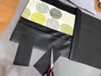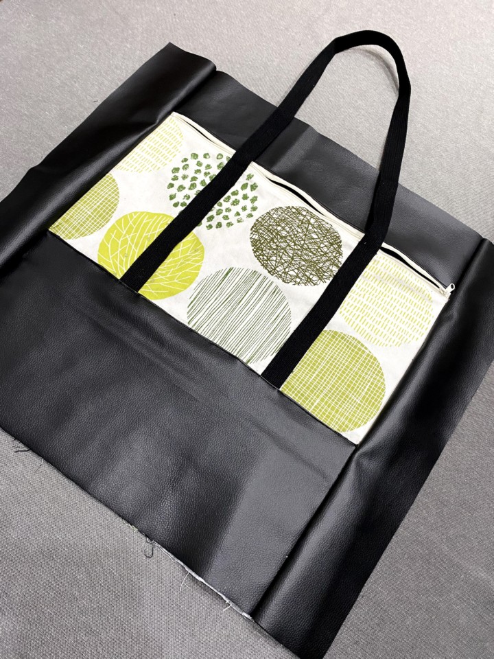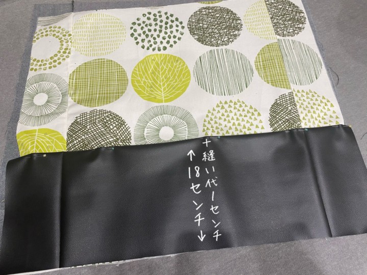 柄の布と合皮を縫い合わせる。縫い代部分の折り曲げを忘れずに!