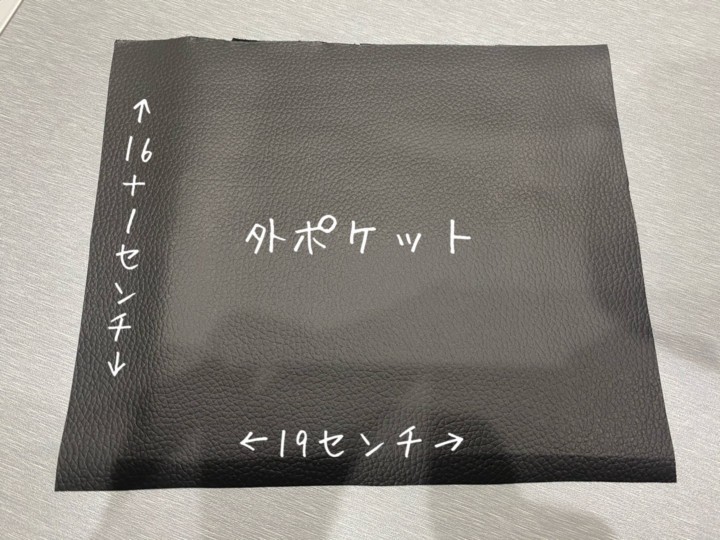 ↑外ポケットは縦16+1cm、横19cm。(縦の1cmは縫い代。横は縫い代なくてOK)