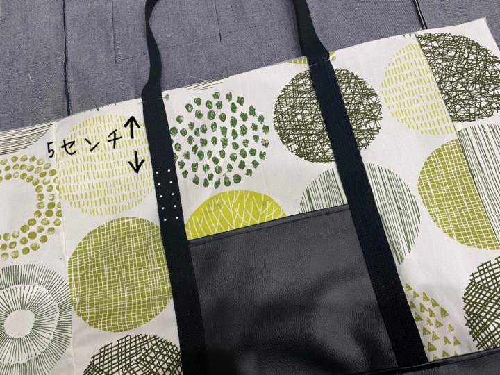 14.大きいポケットを一面合皮の面につけていく。かばんテープとかばんの下の合皮部分を表面同様縫い合わせていく。