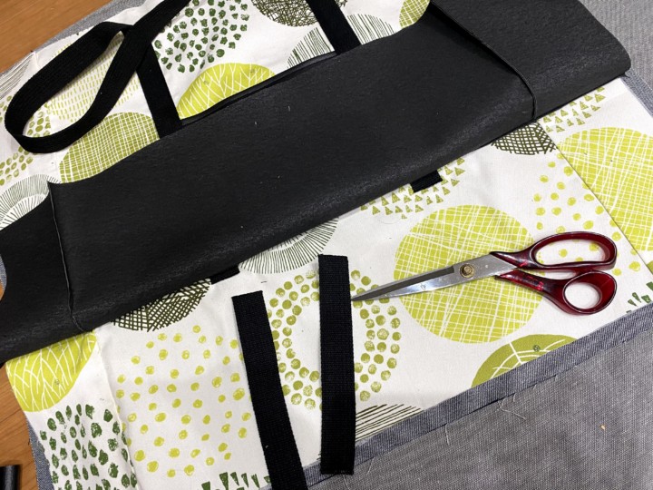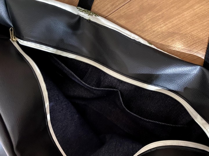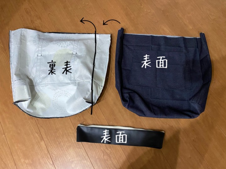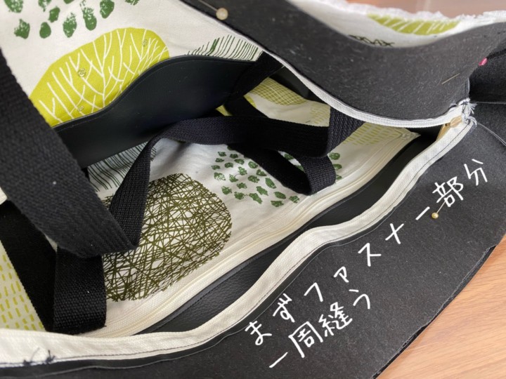 19.かばんの外側の布と、かばんの内側の布と、ファスナー部分がそれぞれ完成した。次はついに合体させていく。