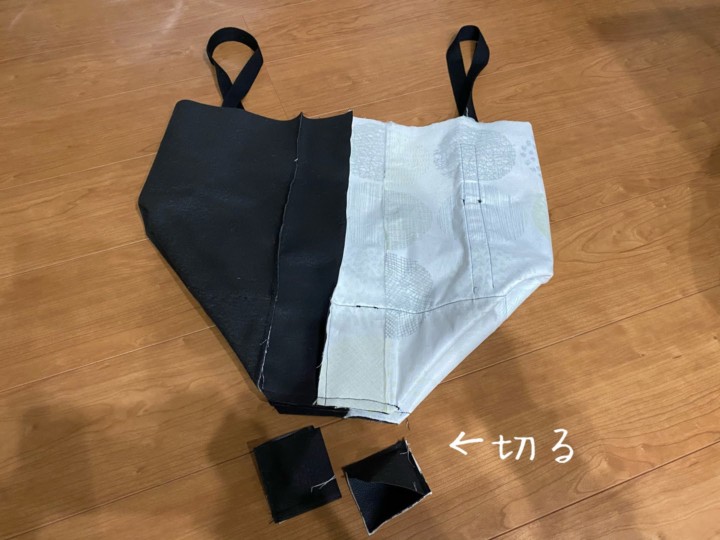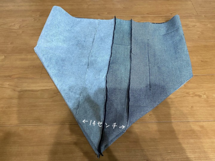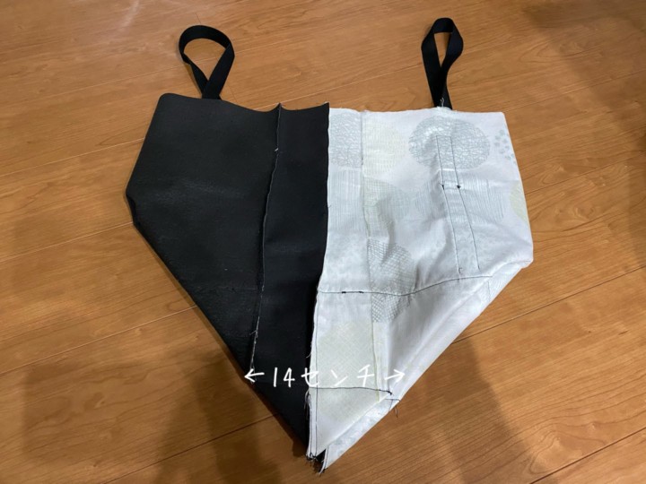 18.中に入れる布も同様。裏表にして、コの字に縫って、このように広げ、14cmのところを縫い、切り落とす。