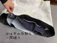 17.かばんの幅を作る。だいたい長さが14cmくらいになる部分を縫う。そして切り落とす。