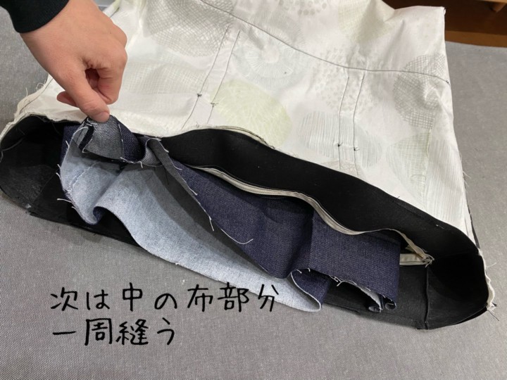 20.しかし分厚いので一気に縫えず、とりあえずファスナー部分から外側の布と合わせて一周縫う。