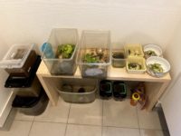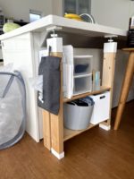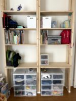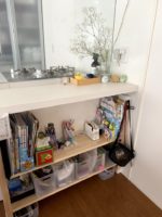 こっちの棚は元々息子のチャレンジ置き場だったが、テーブルの座り位置が変わったのと、娘も小学生になったということで、もっと大きい棚を作ることになり、こちらの棚は私の荷物置きになった。棚には、仕事用の服、毎回使う買い物バック、マスク、お気に入りの本など置いている。