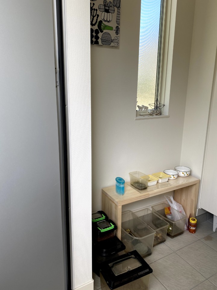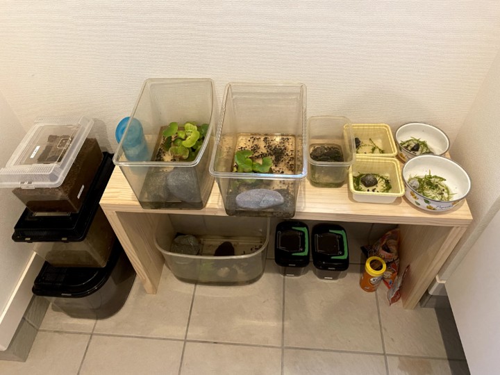 逃がしたり、また増えたり、死んでしまったり、卵があったり、成長したり、いろいろあるが、常に玄関にたくさんある虫かごたち。