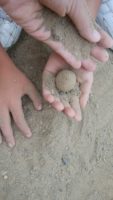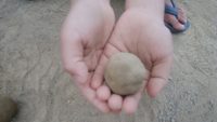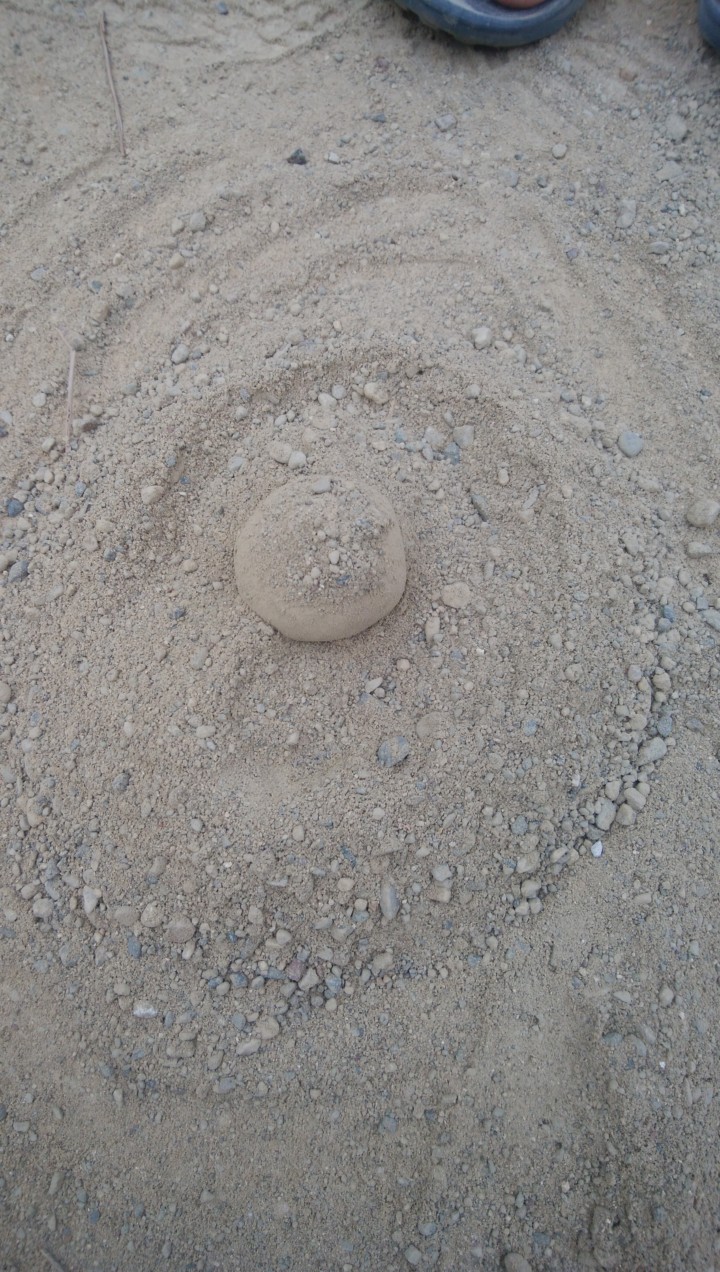 3.あんなドロドロに近い泥団も優しく砂をかけるとなんとなくドロドロ部分が白っぽくなってくる。優しくそっと裏返し、また砂をかけ、泥の部分が消えてくるまで繰り返す。「お!形になってきた!」と思いまだいびつな部分を修正したは駄目!少しでも擦ったり、ギュッと握るとすぐに潰れてしまう。ここは忍耐強く何回も砂をかけ続けるしかない。少しずつずらしながら全体にまんべんなく砂をかけ続ける。