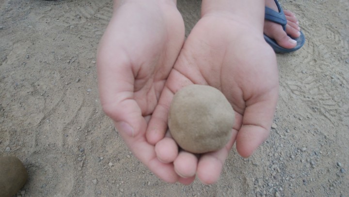 4.気づくとこんなに綺麗な茶色の丸になる。泥の部分はもう見えない。しっかり茶色の砂でコーティングされた状態になった。