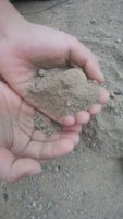 2.手のひらに入るくらいの赤土をとる。この時小石はなるべく取り除く。ギュッと握った時少し形が出来ればOK!その状態で水道水の水を全体に少しずつかけていく。左手に土、右手で水道水をヒョイッとすくいその水をチョンと垂らし、水が土全体につくようにしていく。水が付く度に団子の形に両手で優しくしていく。かけすぎ注意。土も手もドロドロになるがドロドロになりすぎない程度の泥の団子っぽい形にできたらもう一度赤土のところへ。