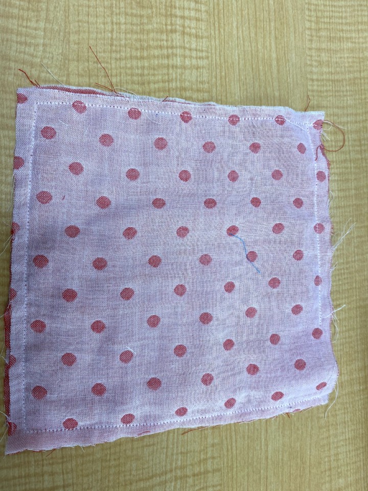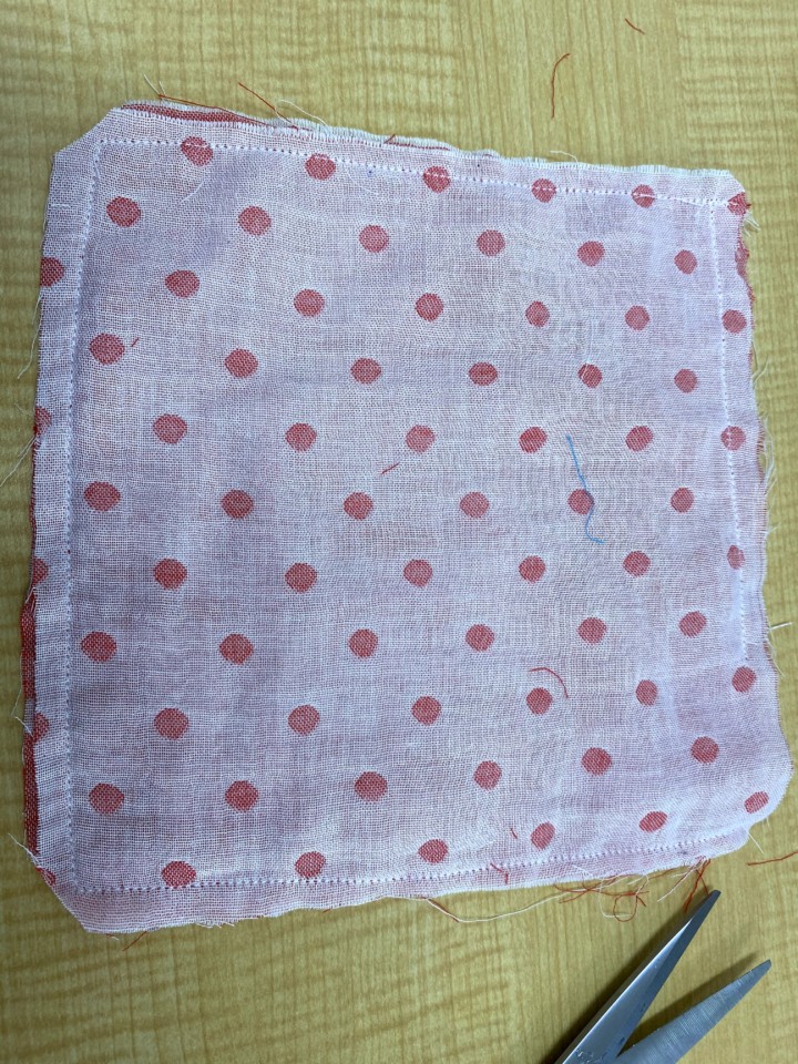 2.表面にひっくり返す用に4cmほどあけ、一周縫う。四隅の角を斜めに切る。ひっくり返したとき角が膨らまないように。