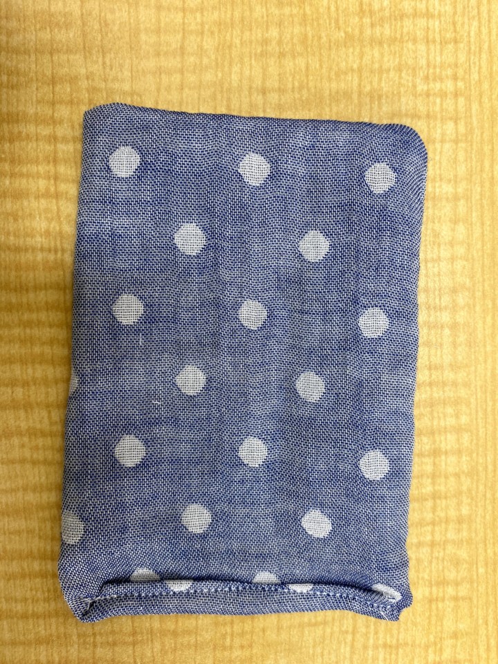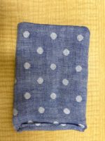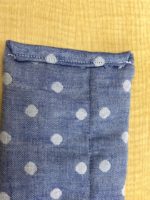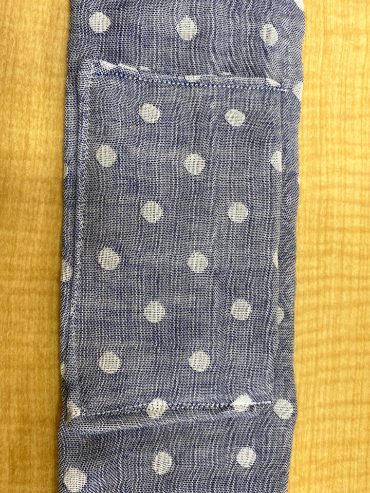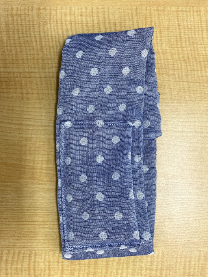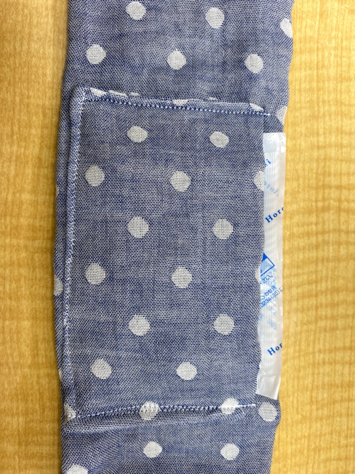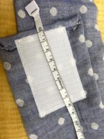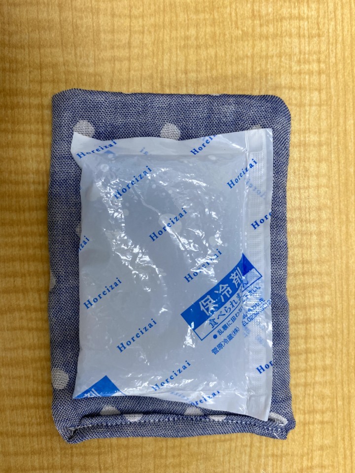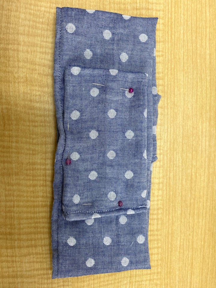4.保冷剤を入れるポケット作り。保冷剤のサイズはだいたい縦9,5cm、横7,5cmなので、それより大き目になるように作る。縦15Cm、横20cmくらいのガーゼを裏側に半分に折り、表面にするように少しあけ一周縫う。表面に直し、出来上がったポケットを真ん中になるように本体に縫いつける。