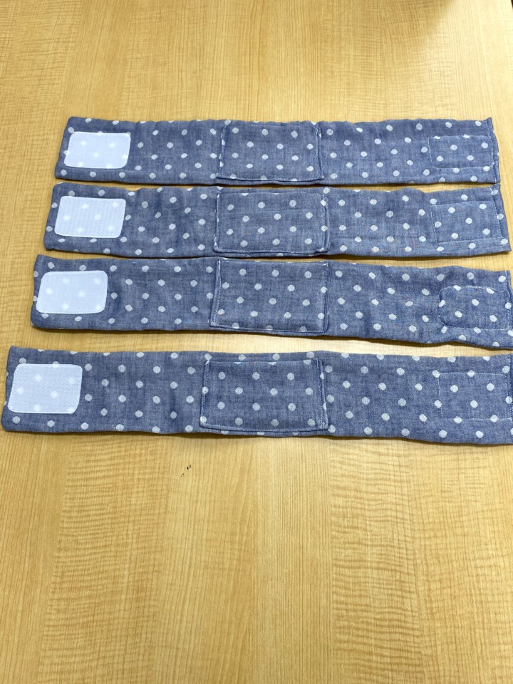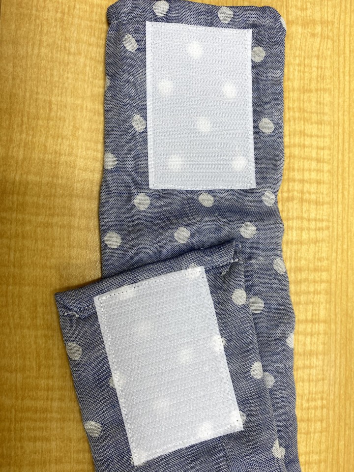 3.大き目の長めのマジックテープをつける。※マジックテープは角は痛いので、必ず丸く切っておく。