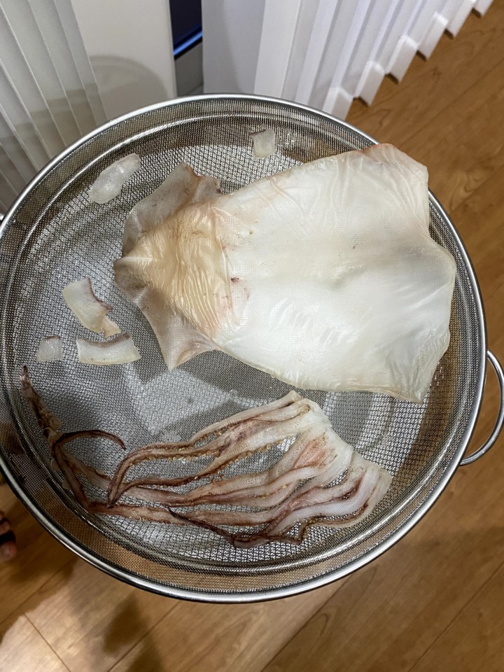 1.まずはイカの下処理。内臓を取り出し、骨のような筋を取り出し、水でよく洗う。