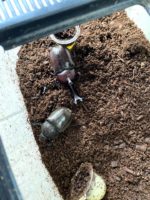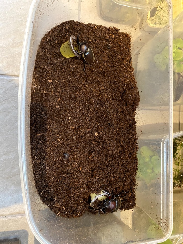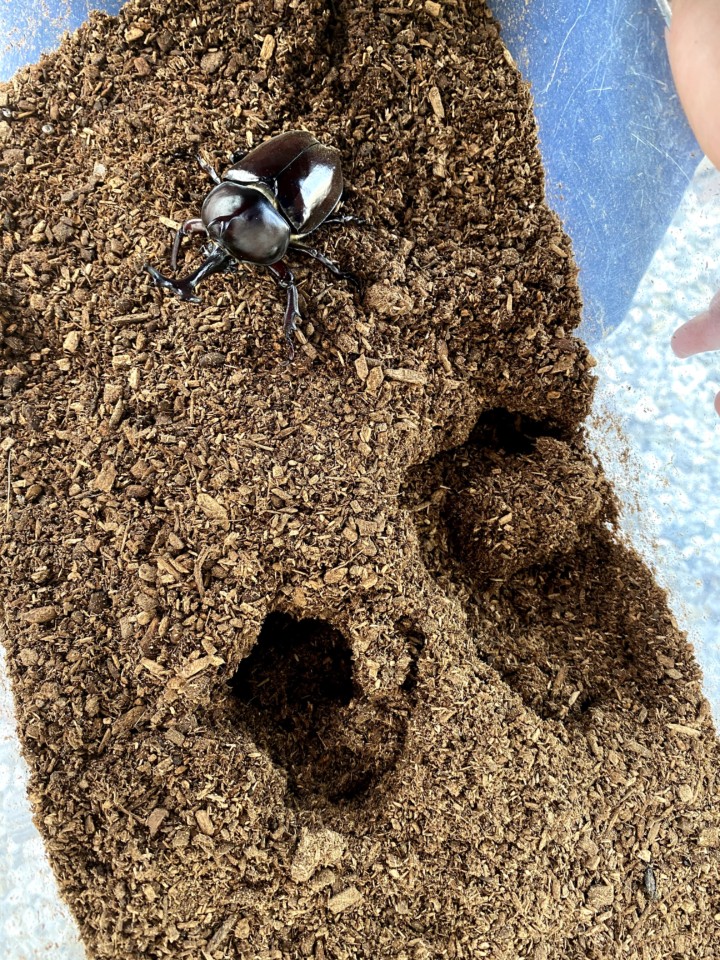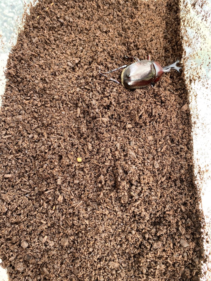 1匹の大きなカブトムシを発見してから、ぞくぞくと成虫になったカブトムシたちが出てきた。全部で5匹くらいいるかな。その中にはメスのカブトムシも!!