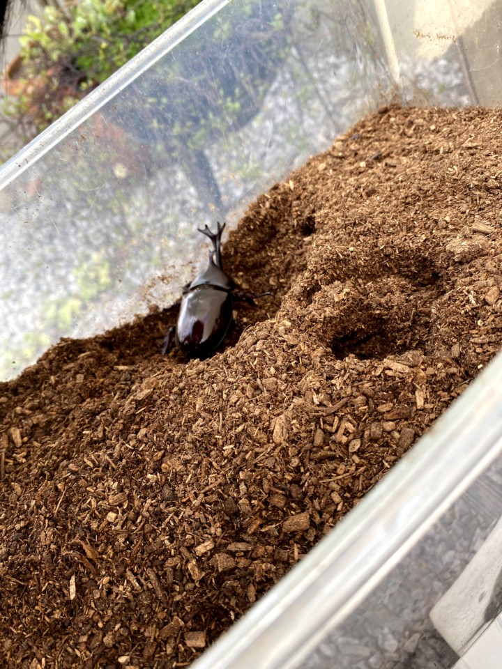 1匹の大きくて立派な角を持った雄のカブトムシが地上に出ていた!!!
