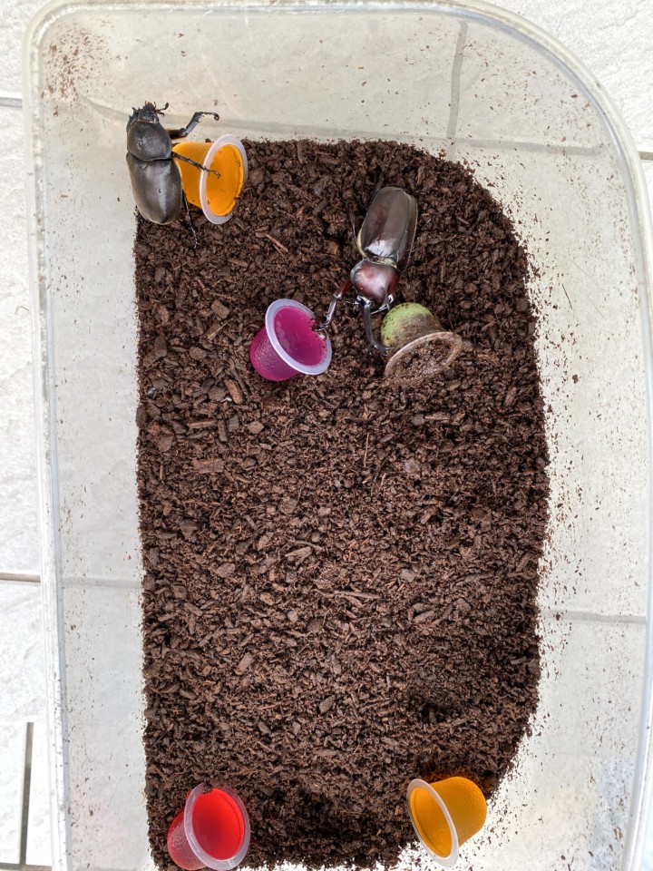 昆虫ゼリーもたっくさん食べる。皆ずっと土の中にいたからお腹がすいているようだ。すぐに空っぽになる。