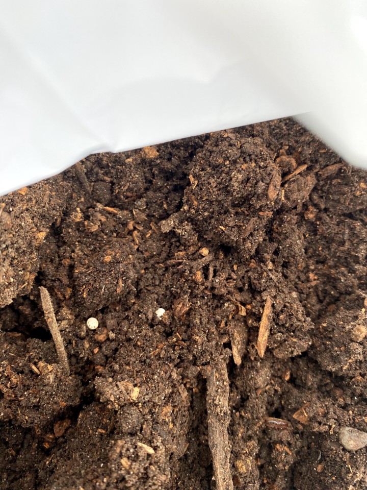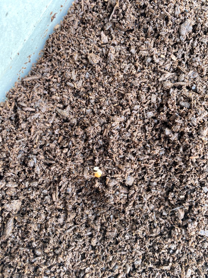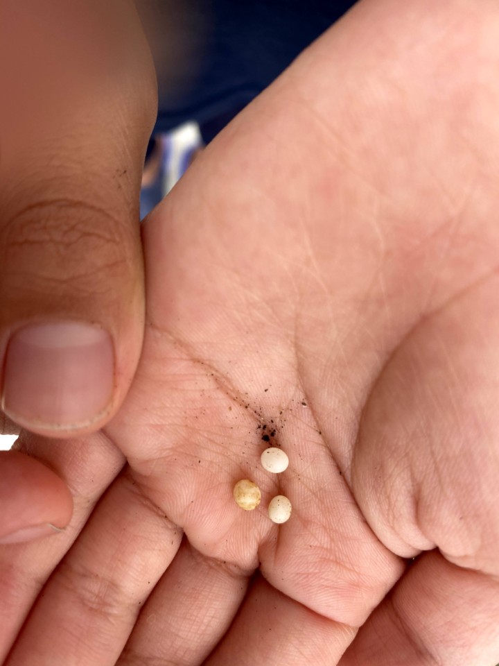 凄く小さな幼虫を発見!!もしかしたらと土の中をほじってみると、黄色い卵や白い卵が数個出てきた!!