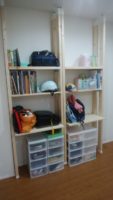 そして、ランドセルや教科書や習字の道具などなどや、洋服やハンカチや給食の道具などなど、すべてを入れる大きな棚を夫に作ってもらい、思い切ってリビングに二つ並べている。