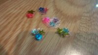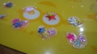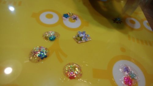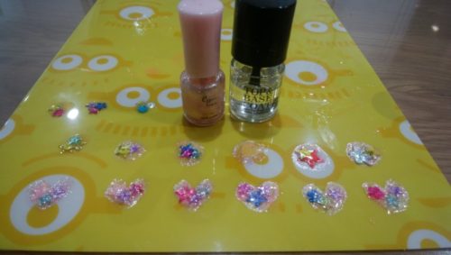 スライム作りの延長で、今度は液体のりを固めてまた違うビーズを入れたものを作り出す。液体のりはなかなか固まらないし、どうしても広がってしまうため、マニキュアを使いだした。