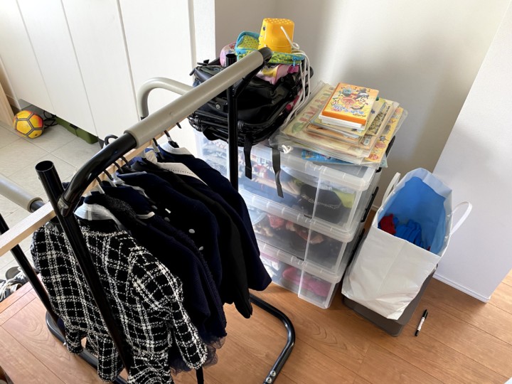 ・夫の筋トレのぶら下がり器具(上部分抜き取り、たまたま家にあったDIY余りの木の棒を横に載せ、フォーマル用服をハンガーでつるした。)
