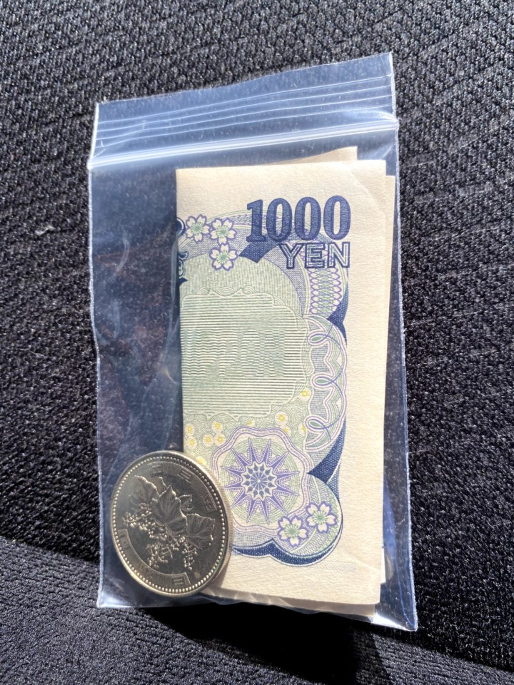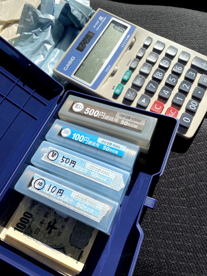 ・小銭(お客様とのやり取りをスムーズにするために5000円札1枚、1000円札8枚、500円25枚、100円50枚、50円12枚、10円50枚、と各100均ケースに入るくらいたくさん入れておく。)合計31600円