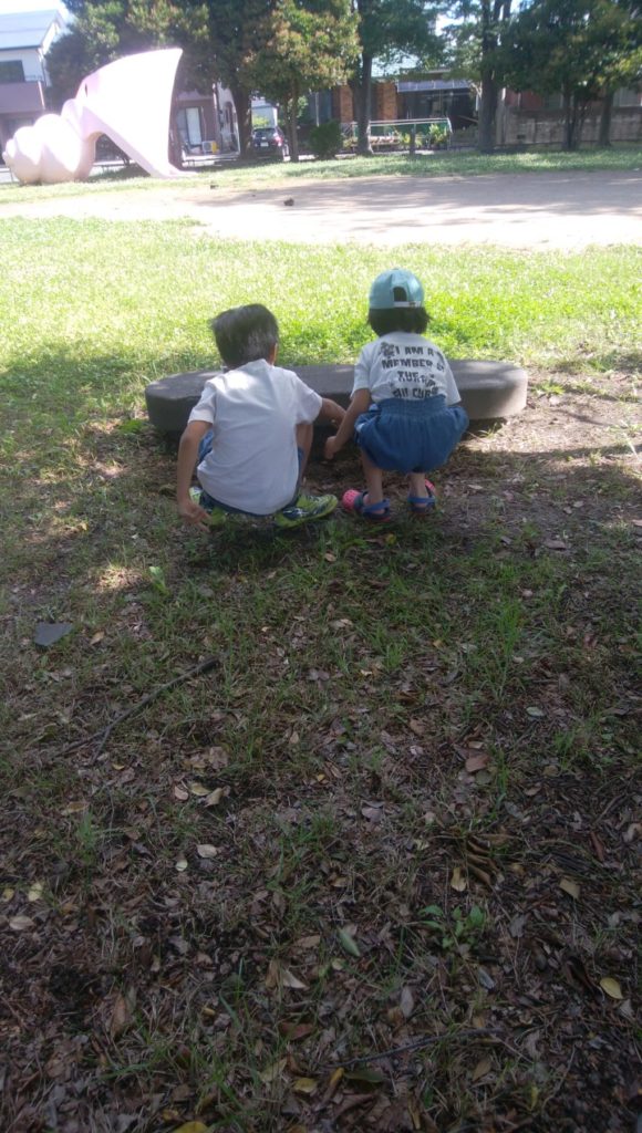 公園で虫さがし。。。土を掘ってみたり、草を抜いてみたり、石をどけてみたり。。