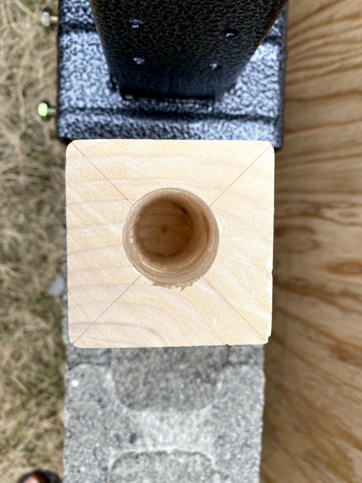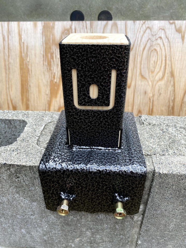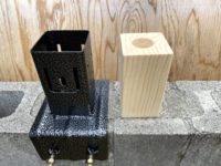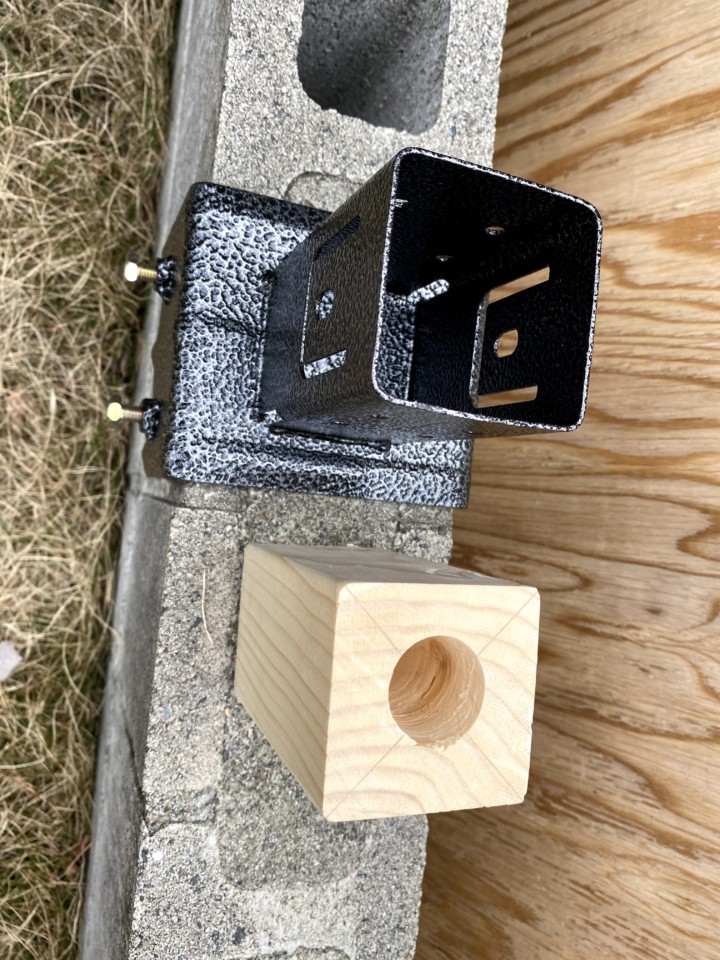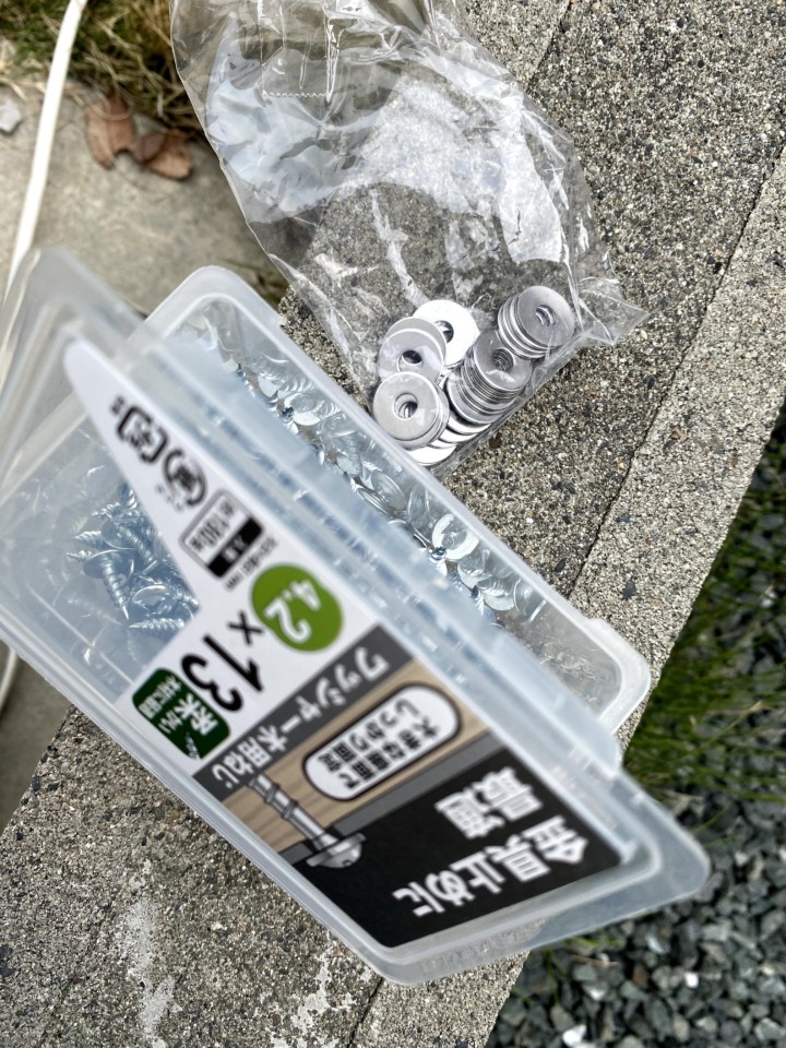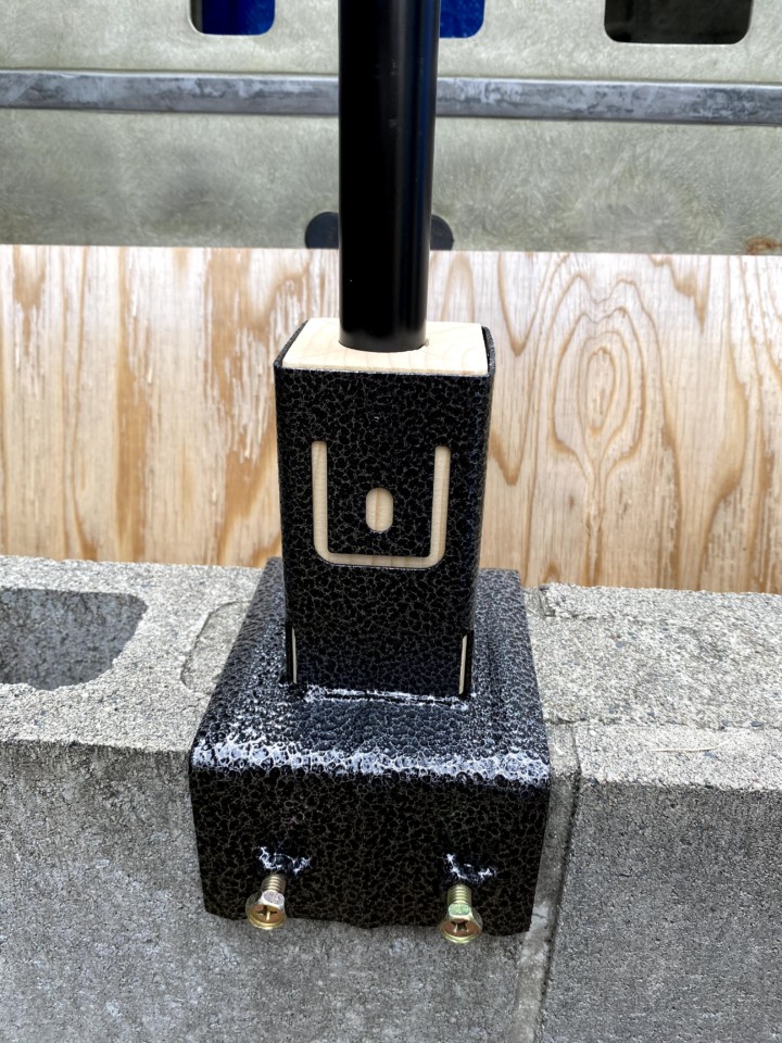 我が家とお隣さんの境はコンクリートが2,3段くらい横に並んでいるので、そのコンクリートにつける金具をホームセンターで購入。そしてその金具の中に入るサイズに切った木も一緒に購入。この木には鉄パイプを入れるためにドリルで穴を開ける。鉄パイプがぴったり入るようにドリルの大きさに注意。鉄パイプとドリルとネジもホームセンターで購入。