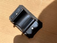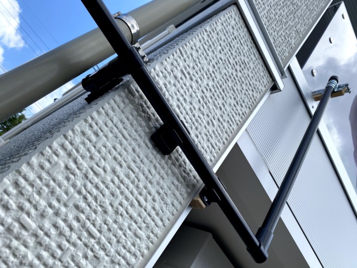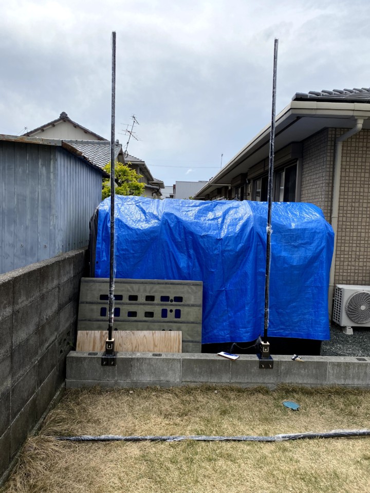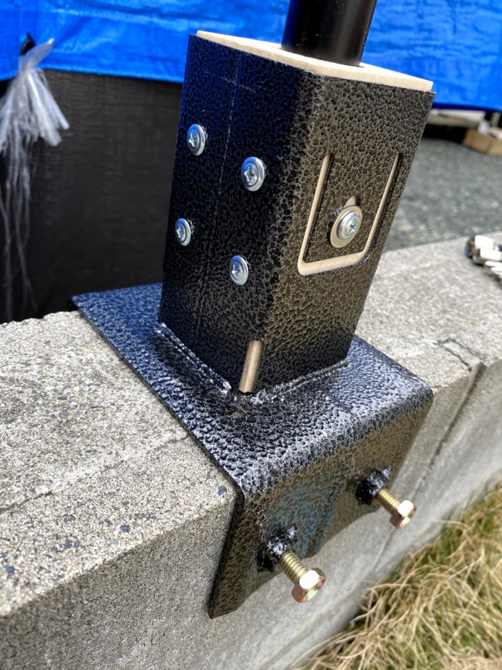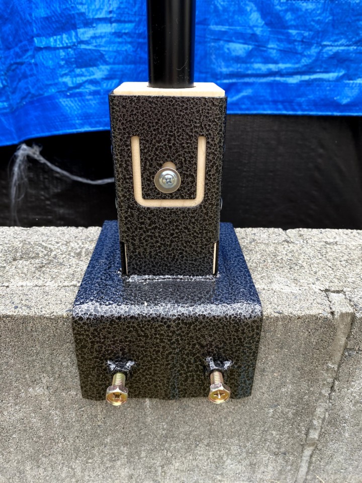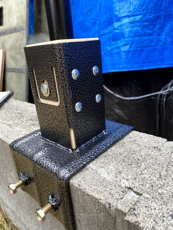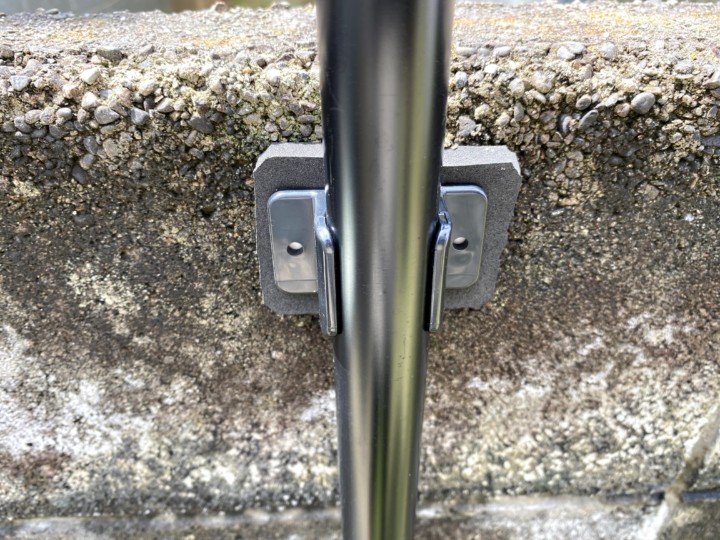 お向かいさんのコンクリートをさりげなく使わせていただくことに。クッションを置いて止め具を設置し鉄パイプを止める。