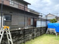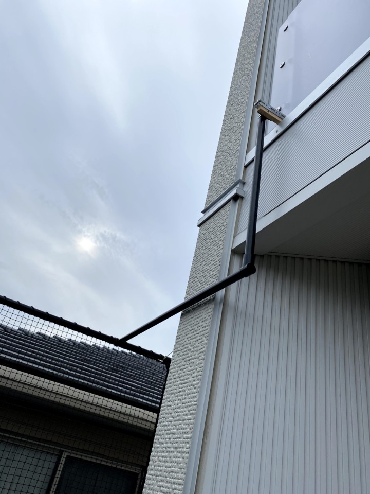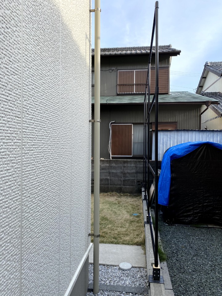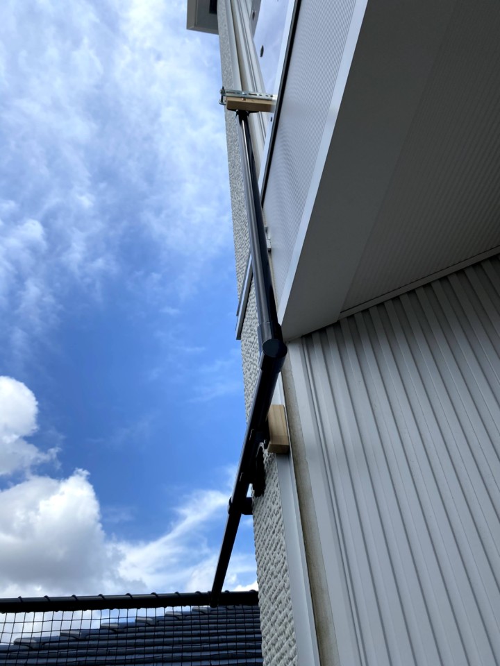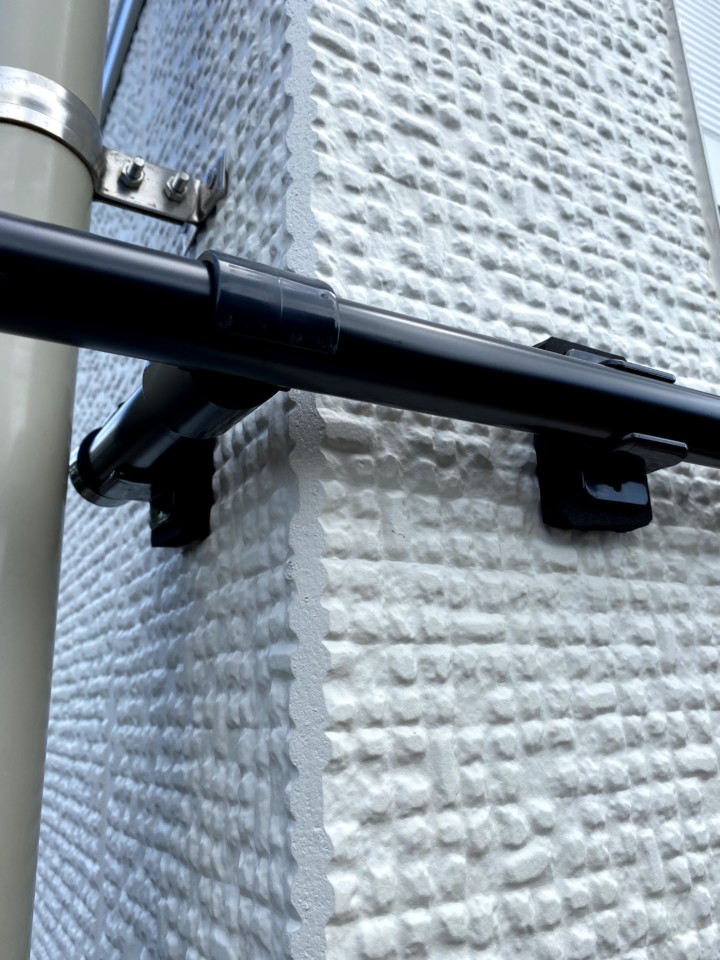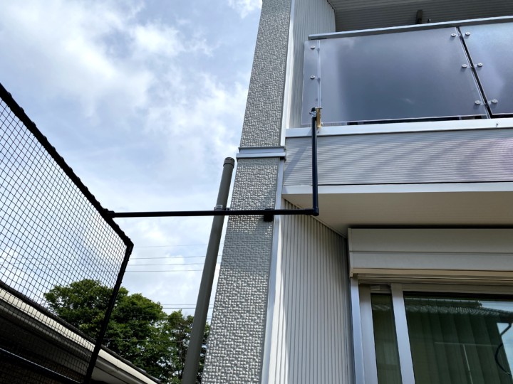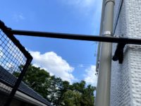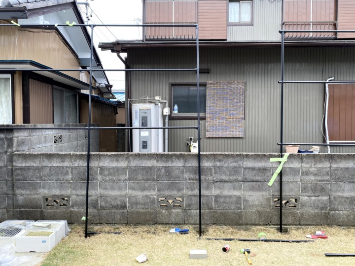 最後にお向かいさんとの境の鉄パイプと、お隣さんとの境の鉄パイプをつなぎ合わせる短い横の鉄パイプをジョイントで繋げる。接着剤で固定する。