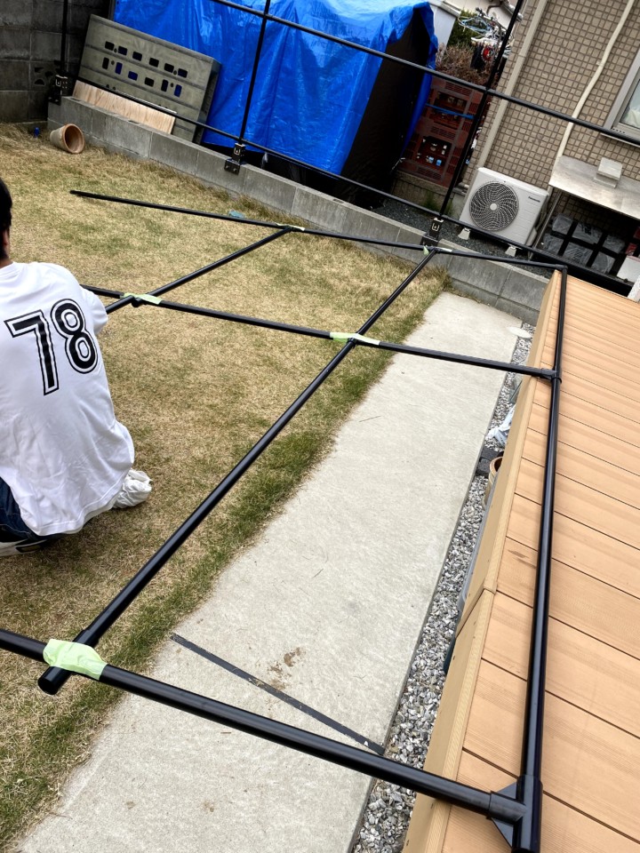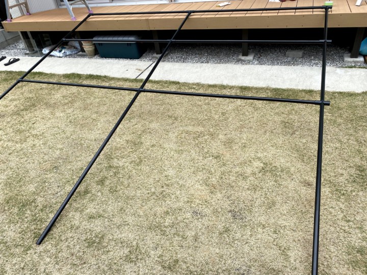 そして、真ん中の横の鉄パイプを繋げ、ジョイントに接着剤を固定して、ひとまず配置は完成。
