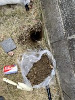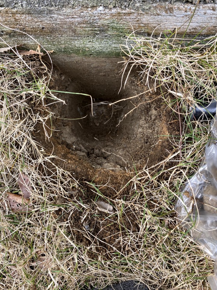 こちらのコンクリートはお向かいさんのコンクリートなので、使用できないため、我が家の庭の芝生をスコップで穴を掘り、コンクリートを流しこむことにした。縦の鉄パイプは計6本。計6か所の穴を掘り、穴の深さを統一させる。統一した深さになったら、ホームセンターに売っていた薄くて小さなコンクリートをそれぞれに入れておくと鉄パイプをまっすぐ立たせることができる。※穴はなるべく小さく深く。