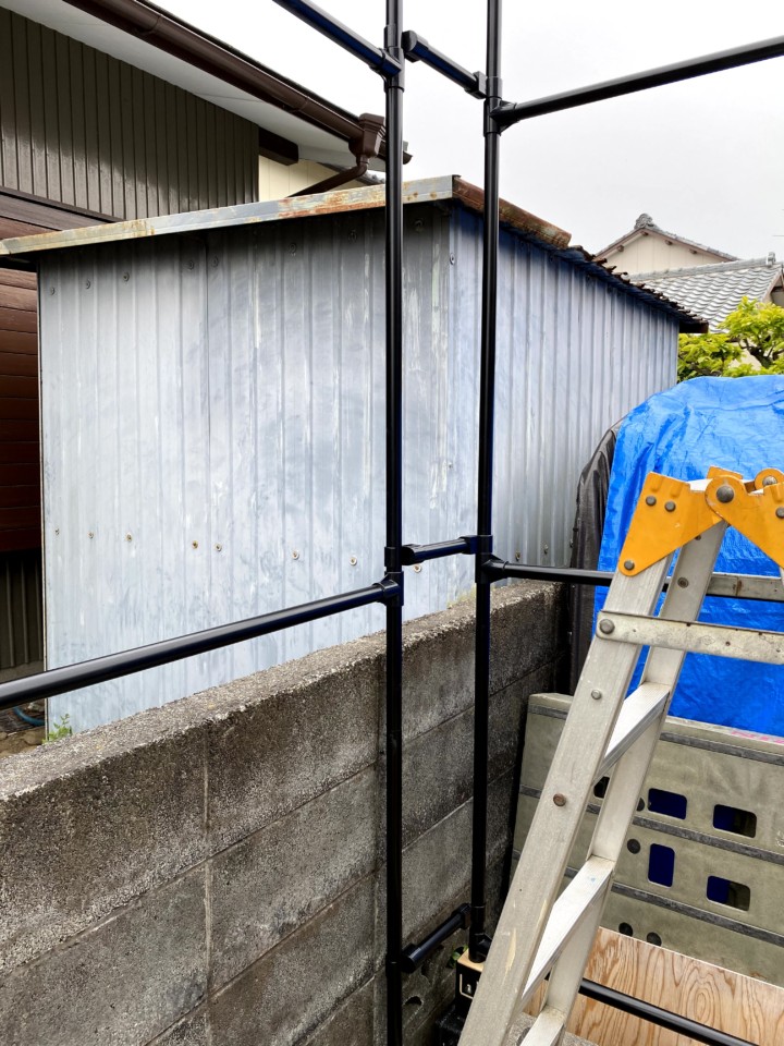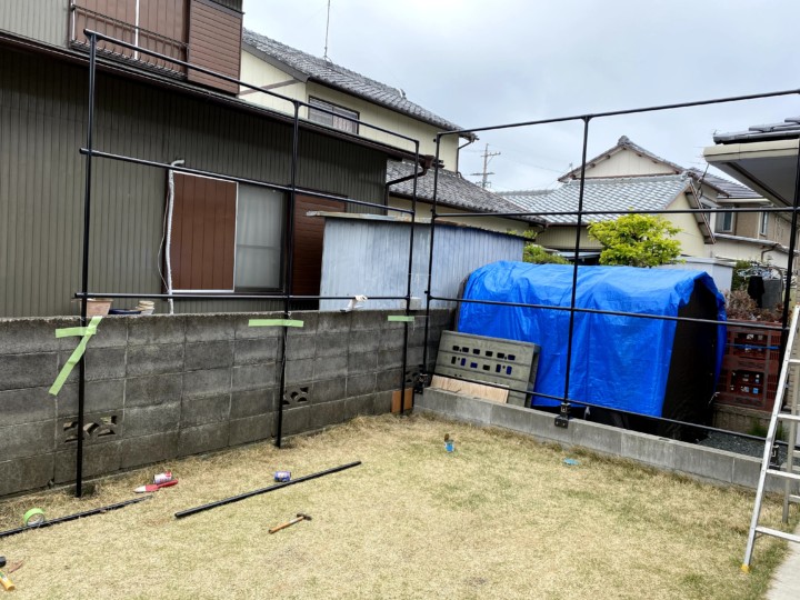 とりあえず鉄パイプは全面完成。コンクリートが固まるまでこのまま。雲行きが怪しいのでコンクリートを流した部分は養生テープで保護。